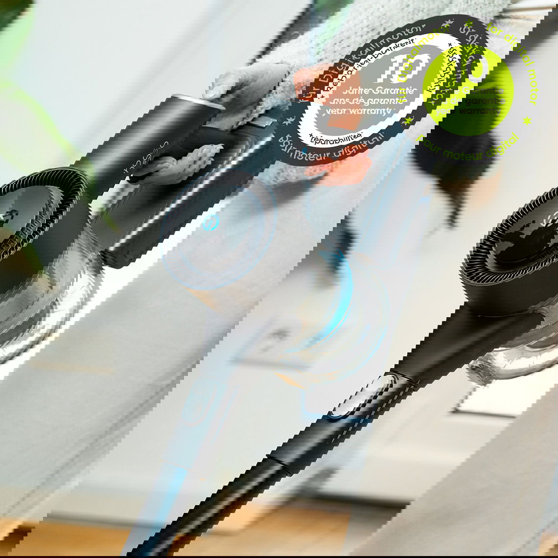 Ausgestattet mit drei Leistungsstufen und einem kraftvollen 450-Watt-High-Performance-Digitalmotor bietet der hoogo S7 beeindruckende Saugkraft für anspruchsvolle Reinigungsaufgaben im ganzen zuhause. Der Motor erreicht über 100.000 Umdrehungen pro Minute und sorgt damit für eine konstant hohe und zuverlässige Saugleistung. Durch die besonders langlebige und verschleißarme Bauweise arbeitet der Digitalmotor effizient und dauerhaft leistungsstark. Deshalb können wir Dir mit voller Überzeugung eine 10-jährige Garantie auf den Digitalmotor bieten.